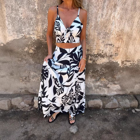 Women's Two-Piece Set – Backless Halter Crop Top – Pleated Long Skirt – Breathable Design