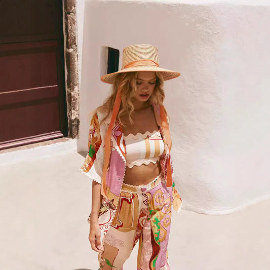 Women's Two-piece Set – Crop Top with Lace Straps – A-line Skirt with Ruffles