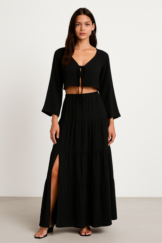 Women's Set – Cotton Linen – Cropped Cardigan with Tie – High Slit Skirt