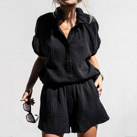 Women's Lounge Set – Cotton – Relaxed Fit – V-neck Top with Buttons – Elastic Shorts