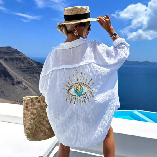 Women's Long Cardigan – Light Cotton – Oversized Fit – Open V-Neck – Sequin Detail