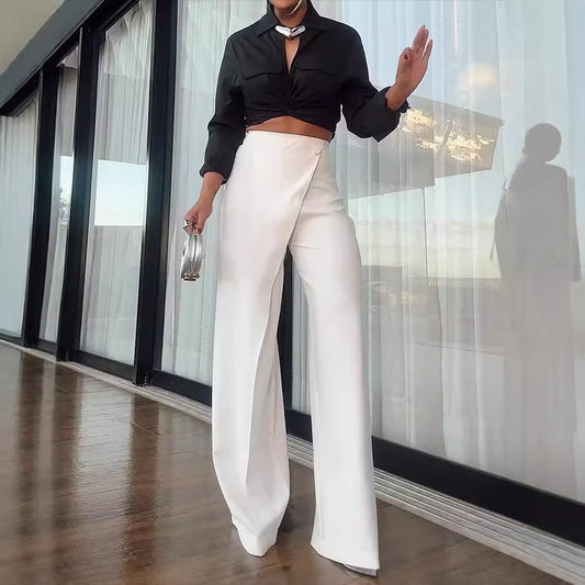 Women's Set – Satin Crop Top with Tie – High-Waisted Wide Pants