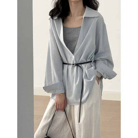 Women's Blouse with Revere Collar – Relaxed Fit – Light Cotton – Tie Belt at Waist