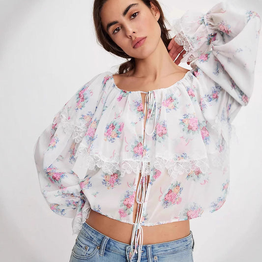 Women's Blouse – Chiffon – Loose Fit – Long Sleeves – Floral Pattern – Lace Trim