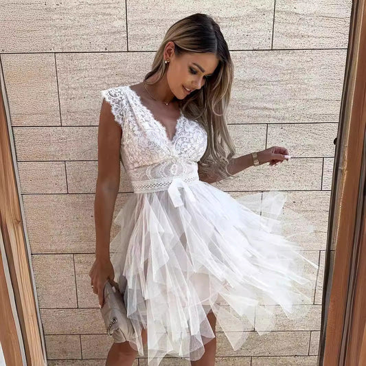 Party Dress for Women – Lace Top – V-Neck – Sleeveless – Tulle Skirt – Knee Length