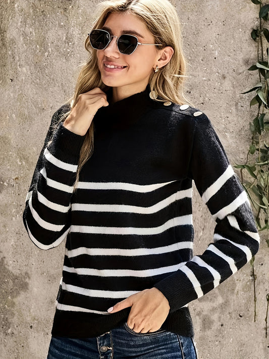 Women's Striped Knit Sweater - Mock Neck - Shoulder Button Accent - Long Sleeve Casual Fit