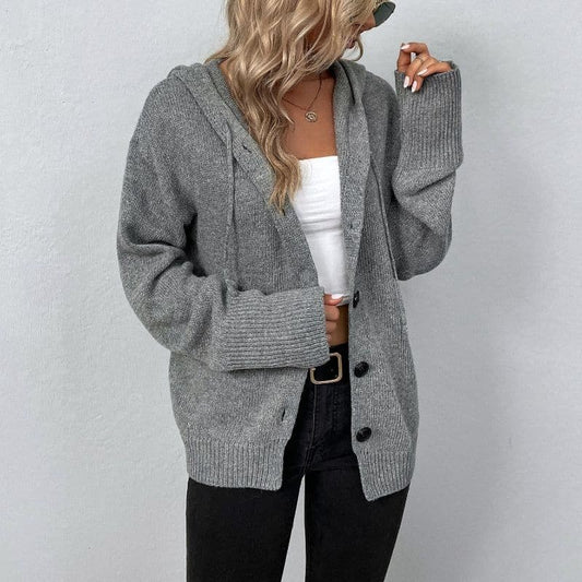 Women's Knit Cardigan - Soft and Warm - With Hood and Button Closure - Relaxed Fit
