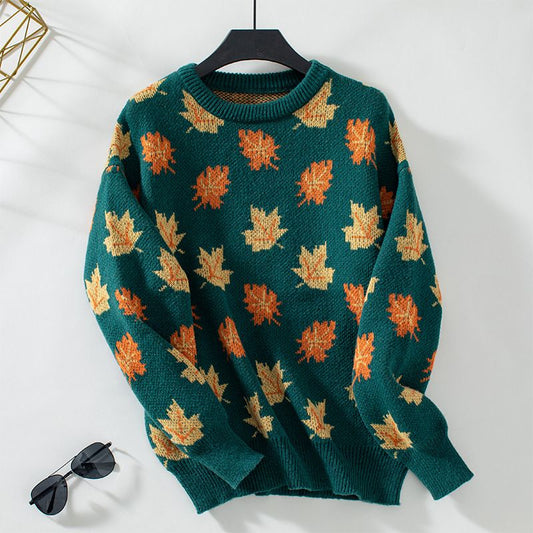 Women's Knit Sweater - Leaf Pattern - Relaxed Fit - Long-Sleeved Crew Neck