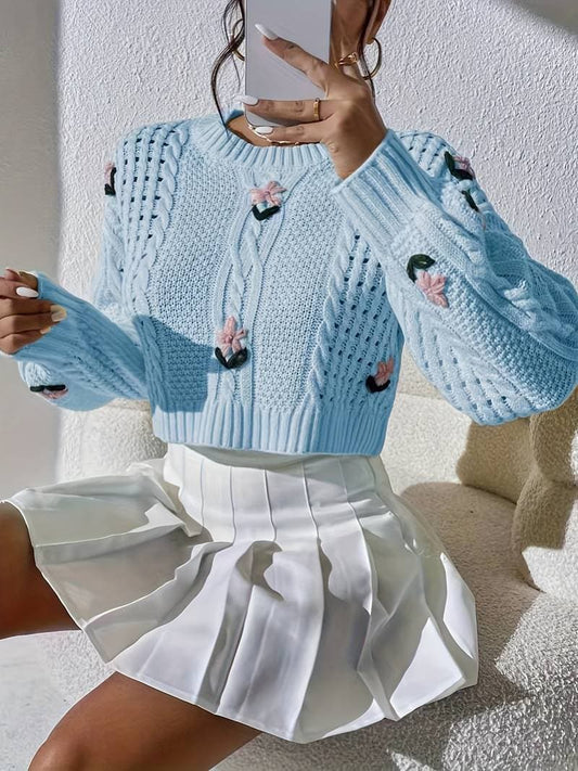 Women's Knit Sweater - Cable Knit - Embroidered Flowers - Cropped Fit - Round Neck