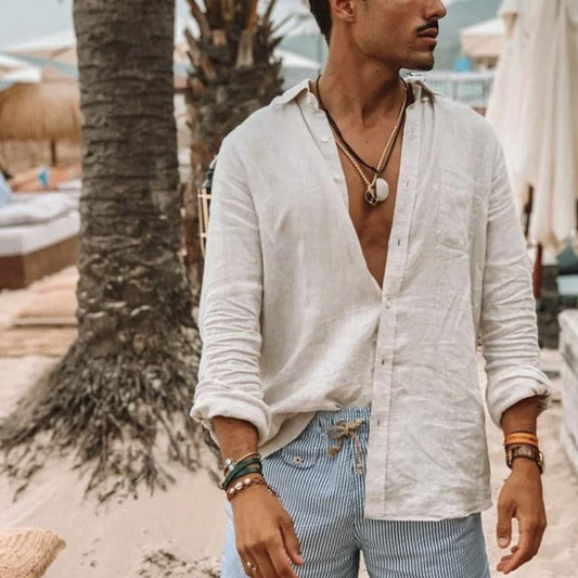 Men's Shirt in Linen - Breathable and Light - Long-Sleeved - Relaxed Fit - Button Closure