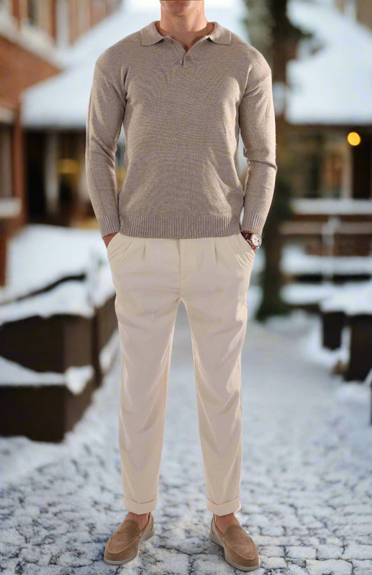 Men's Knit Polo - Soft Knit - Tailored Fit - Long-Sleeved with Button Closure