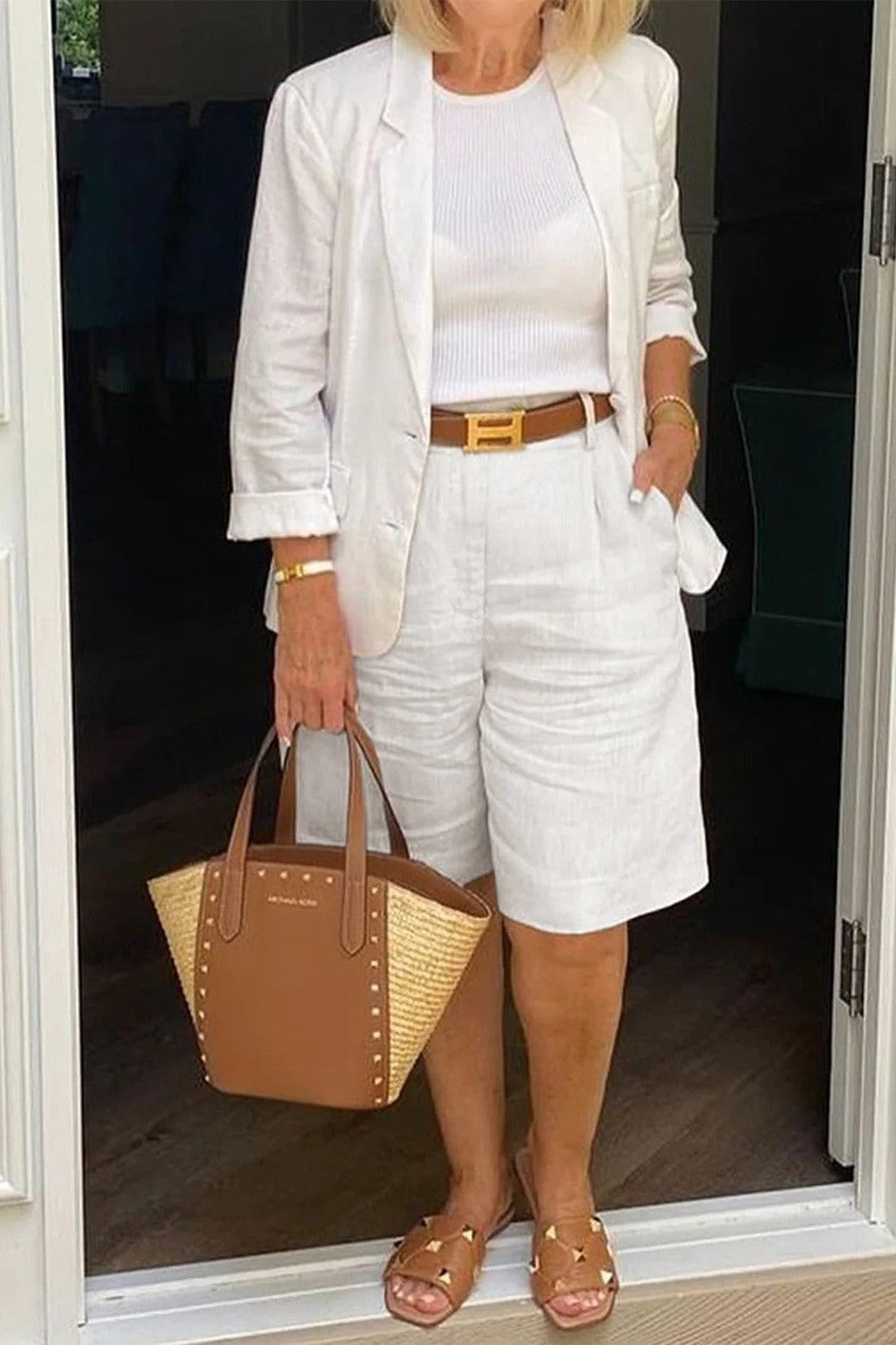 Oplev ultimativ komfort og stil med vores nye Dame Blazer og Shorts Sæt – Afslappet Pasform – Knælængde – Åndbart Mix. Perfekt til sommer og afslappede dage, dette sæt er åndbart og sikrer et elegant, men ubesværet look. Ideel til kvinder, der søger et alsidigt og moderne outfit.
