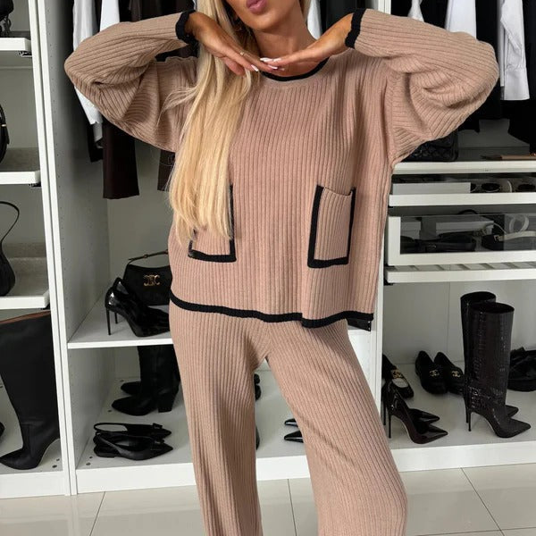 Discover Alma-Hansens Women's Loungewear Set – Ribbed Knit – Relaxed Fit – Contrast Details – Long Pants. This soft and comfortable loungewear set is perfect for relaxing at home. The knitted design and loose fit ensure ultimate comfort and style for women, with fine contrast details. Ideal for lounging and everyday use.