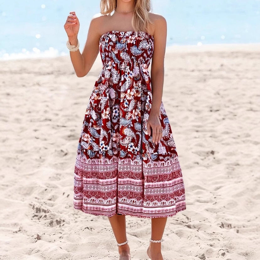 Women's Strapless Dress – Cotton Blend – Floral Print – Wide Silhouette – Midi Length from Alma-Hansen. Embrace summer in this beautiful, strapless dress with floral print and a flattering, wide silhouette. Perfect for any occasion!