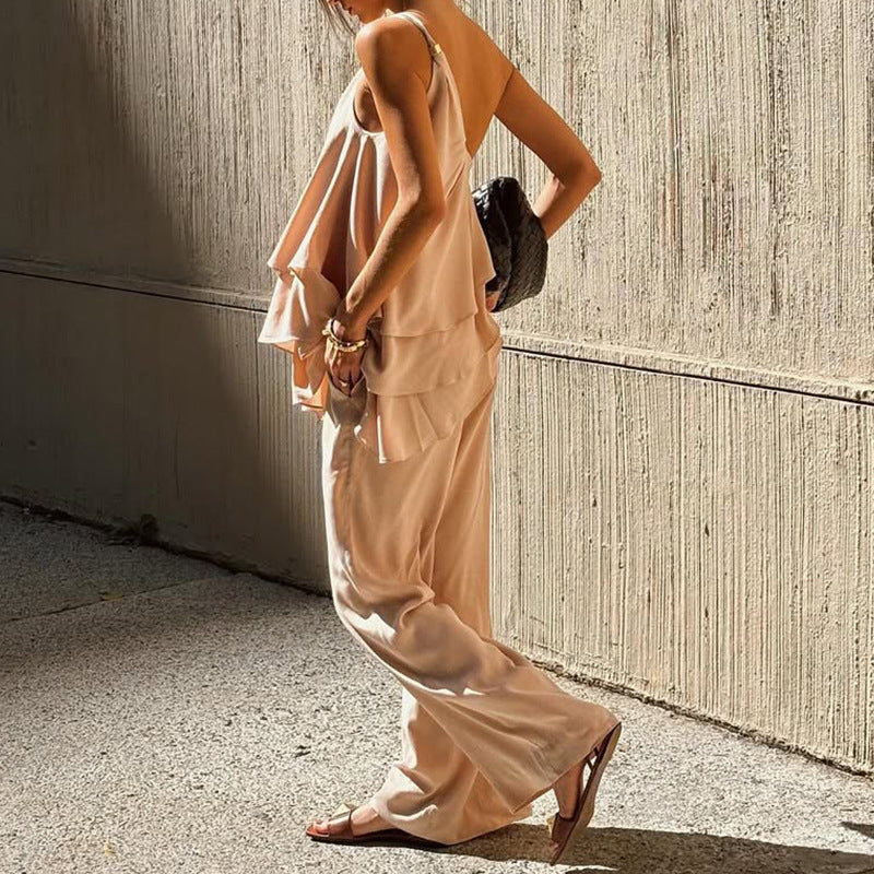 Experience ultimate comfort and style with our Women's Two-Piece Set, combining an elegant Asymmetric Ruffle Top with loose, Wide-Leg Pants. Made from Soft Breathable Quality for all-day well-being. A must-have set!
