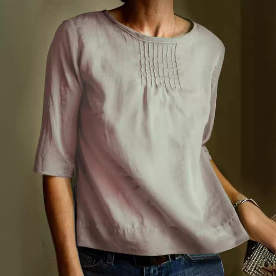 Women's blouse in cotton linen mix with a loose fit and 3/4 sleeves, as well as an elegant pleated front. This light and airy blouse is perfect for everyday wear and casual occasions. Enjoy the comfort and style of this versatile garment.