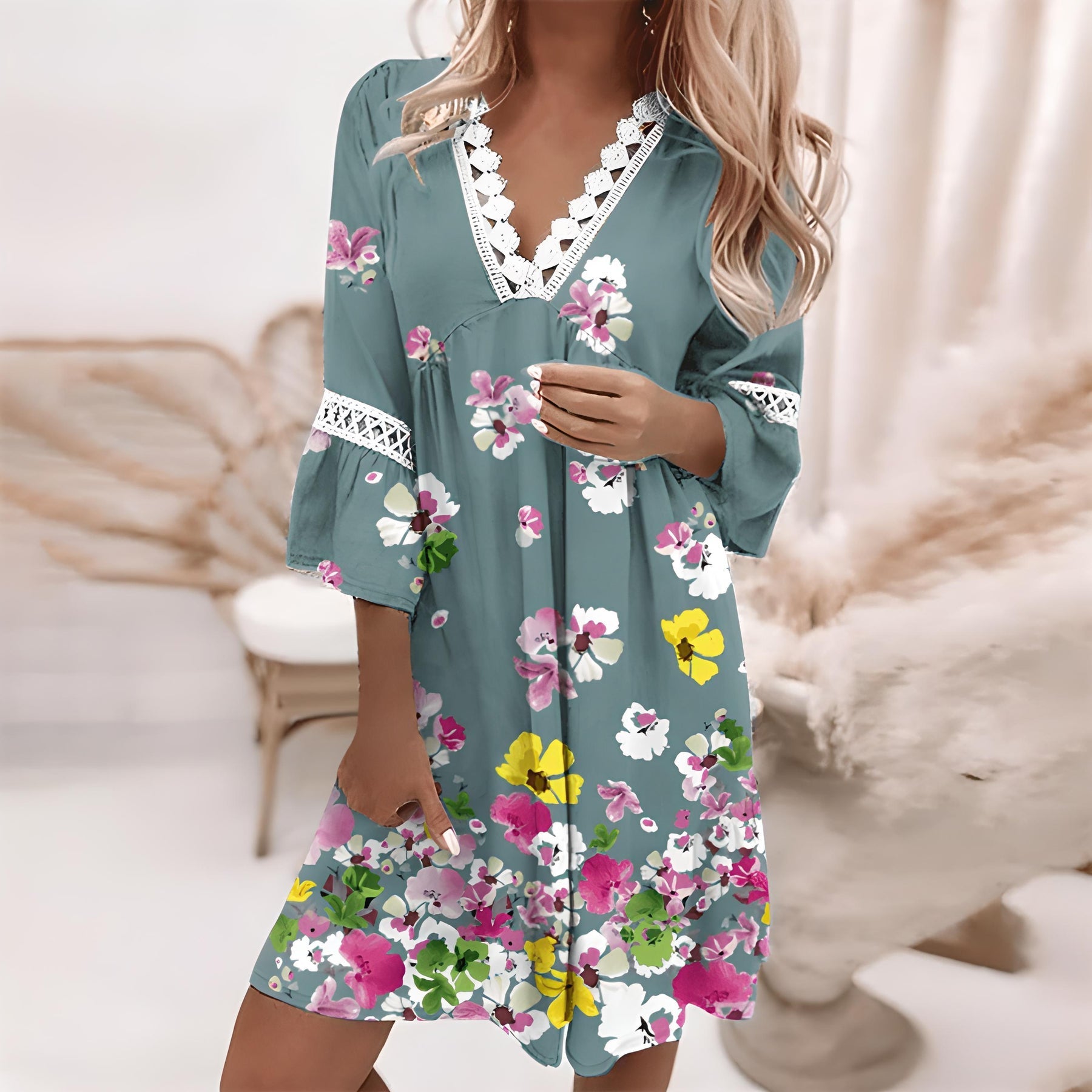 Experience comfort with Alma-Hansen's Women's Dress – Relaxed Fit – V-Neck with Lace – 3/4 Ruffle Sleeves. This lightweight, breathable dress is perfect for everyday and leisure, with elegant lace and feminine design. Ideal for your casual style.