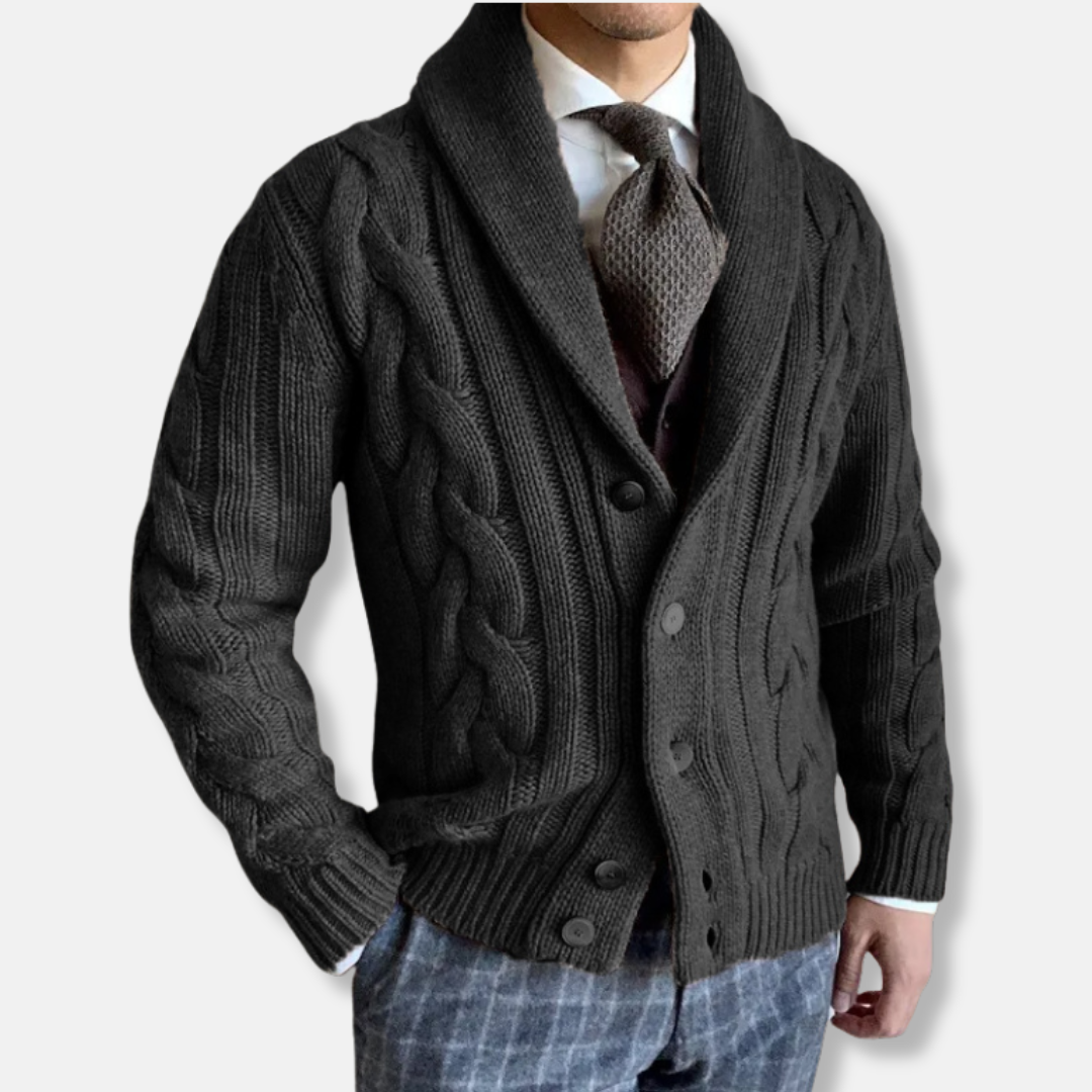 Design: Cable Knit, Shawl Collar, Button Closure