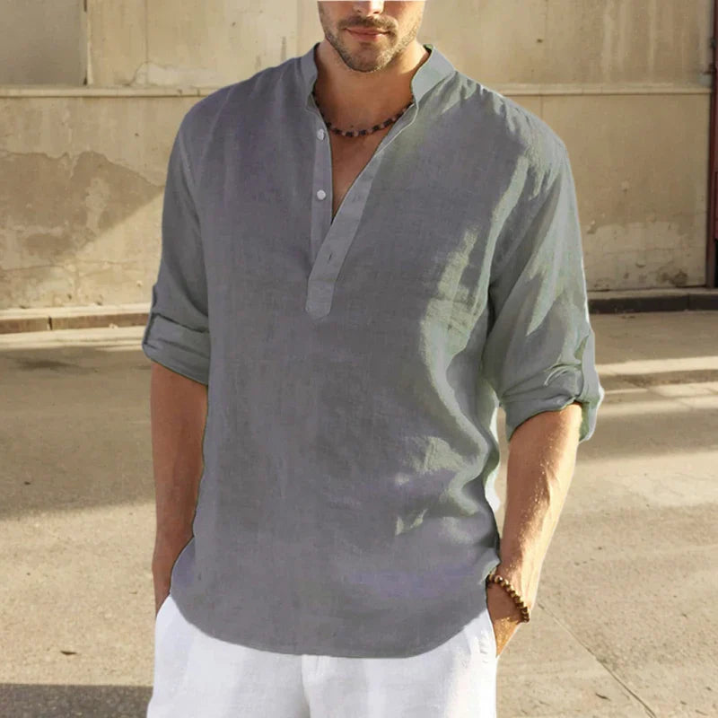 Experience ultimate comfort with Alma-Hansen's Men's Shirt – Loose Fit. This versatile men's shirt with long sleeves and an elegant stand-up collar is made of breathable material for perfect style and well-being all day long.