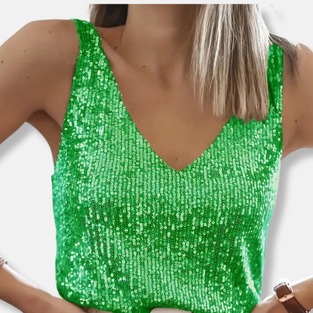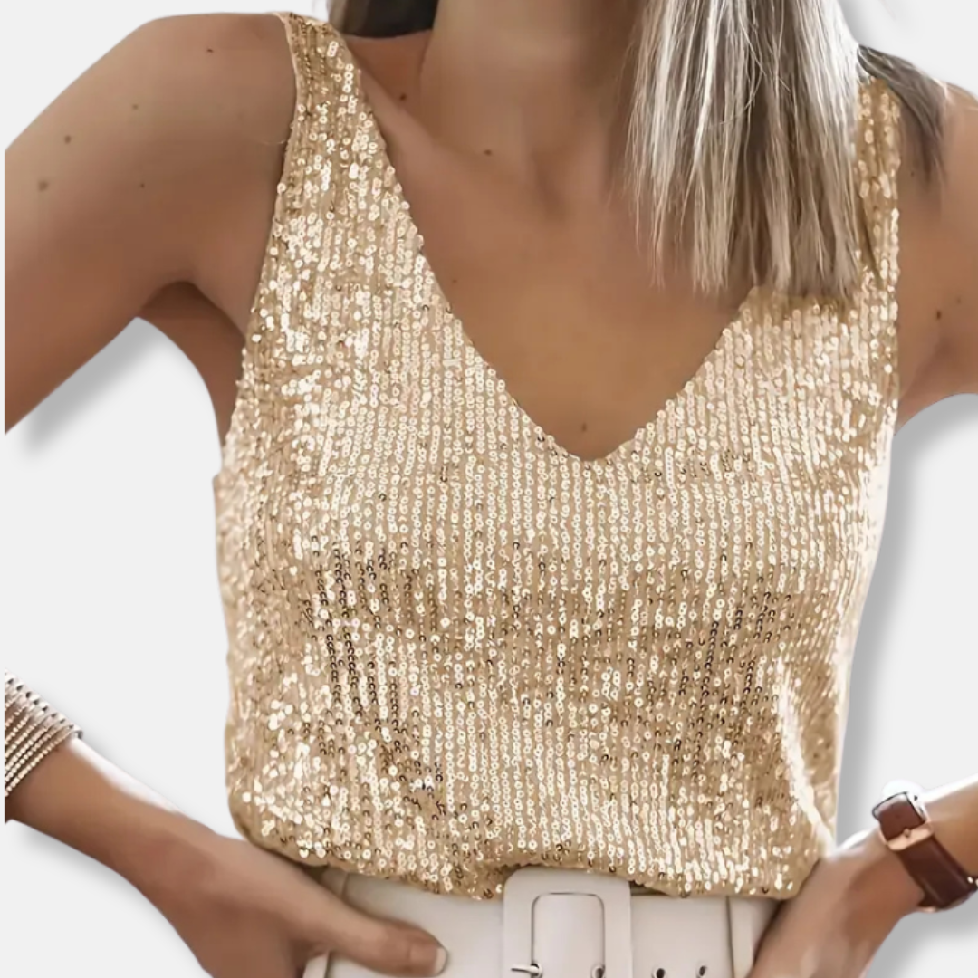 This relaxed fit sleeveless top for women features a sophisticated V-neckline and a hip-length cut, perfect for a party. Adorned with sequined details, this solid piece offers an elegant silhouette.