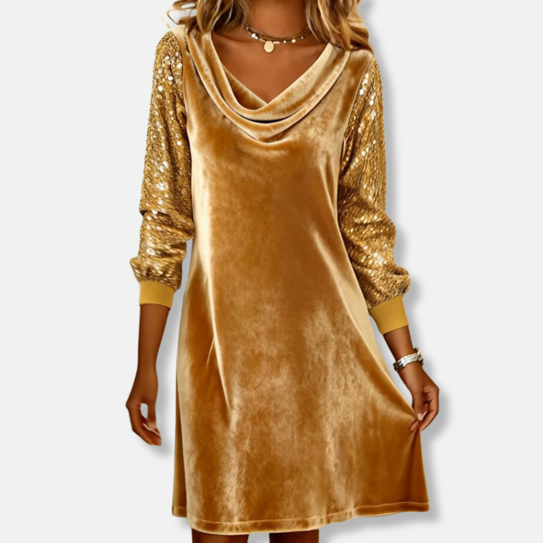 Crafted for women, this elegant shift dress presents a flattering mini length, ideal for evening occasions. It features a graceful cowl neck and solid design, enhanced by long sequined sleeves that add a refined touch.