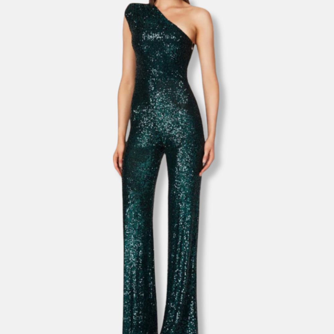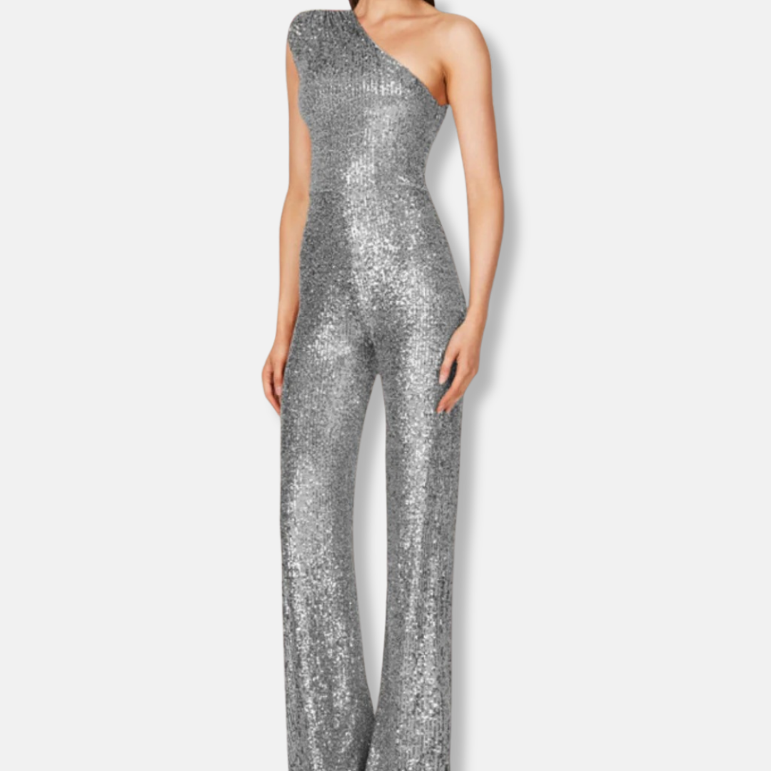 This full-length jumpsuit for women is designed with a wide leg fit and a distinctive one-shoulder neckline. Perfect for evening wear, this sleeveless piece is elegantly detailed with sequins.