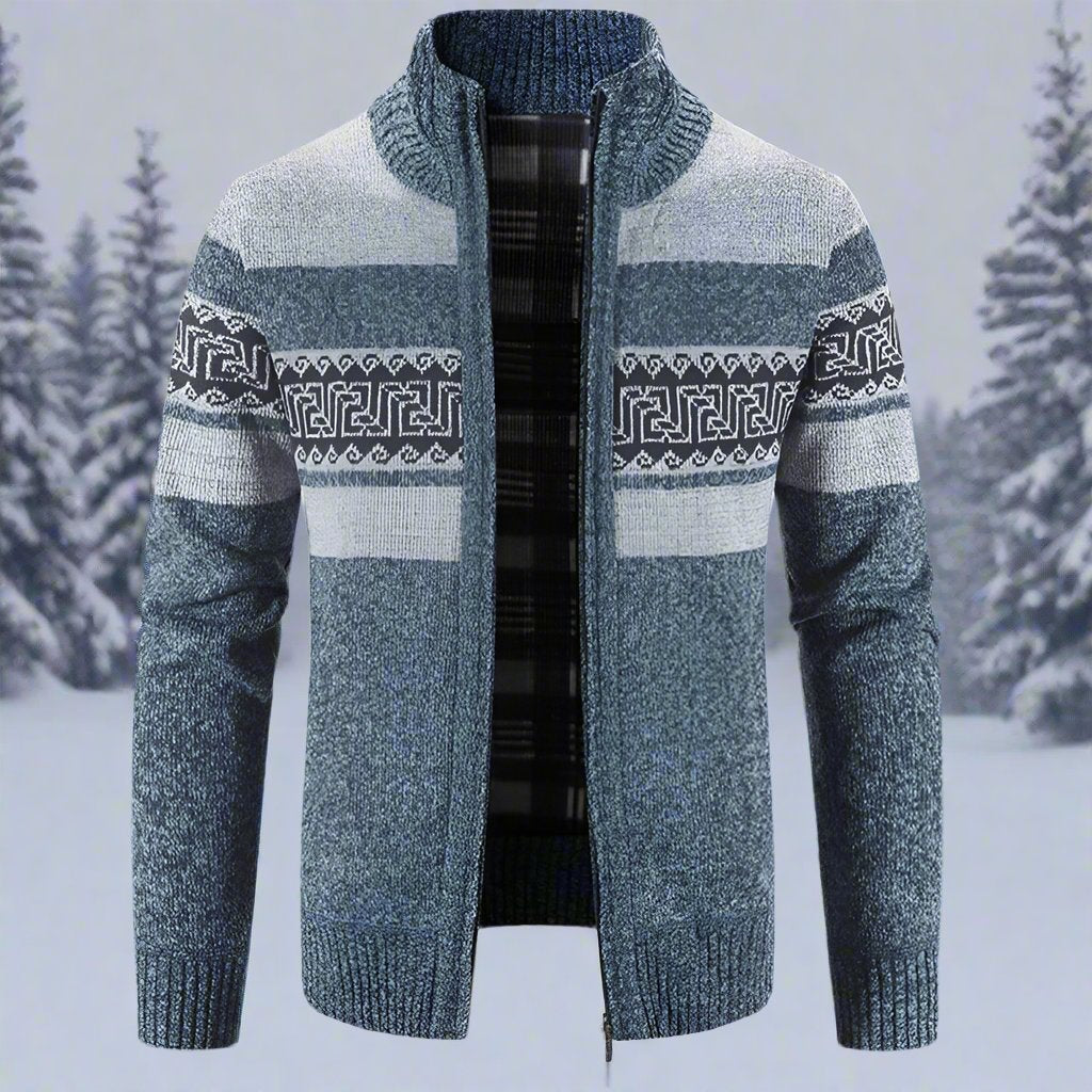 Men's Knit Cardigan - Zipper & High Collar - Patterned Design - Ribbed Edges Comfort Fit
